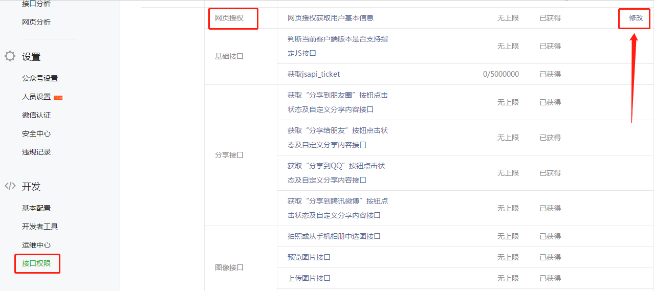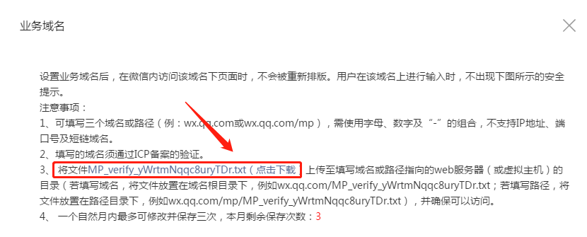 2)登陸進(jìn)入微信公眾平臺(tái)——接口權(quán)限——網(wǎng)頁授權(quán)“修改”——業(yè)務(wù)域名“設(shè)置”--下載txt文檔