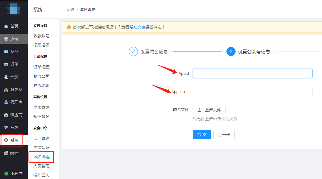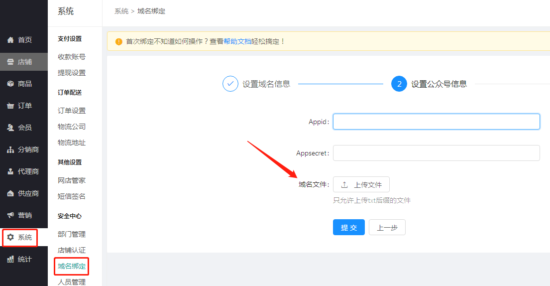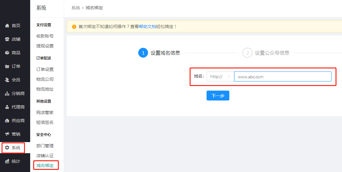 登陸安菲云后臺(tái)--系統(tǒng)--域名綁定--設(shè)置域名信息,填寫需要綁定的獨(dú)立域名,如域名是www.abc.com.則按照下圖所示填寫,填寫完點(diǎn)擊進(jìn)入下一步;