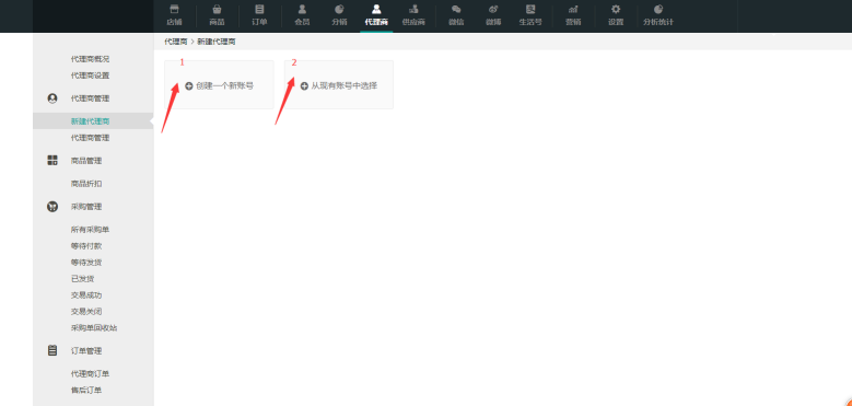 一、根據(jù)代理商是否存在賬號進行選擇。有的代理商之前未在商城注冊,這時候商家添加代理商賬號時需要點擊“創(chuàng)建一個新賬號”按鈕,如果代理商之前已經(jīng)是商城會員,點擊“從現(xiàn)有賬號中選擇”按鈕。