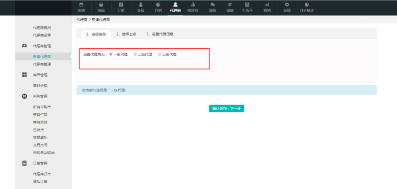 ① 選擇代理商級別,在對應(yīng)要添加的級別前進行勾選。完成之后點擊“下一步”。