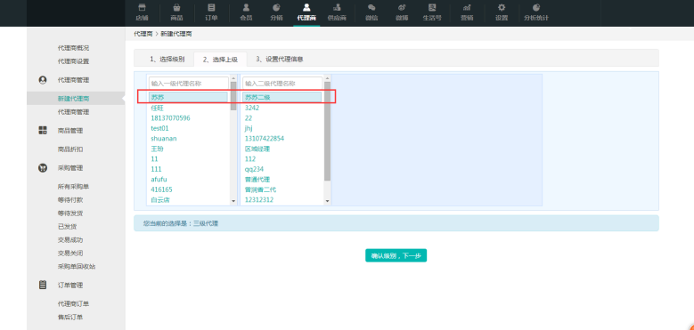② 一級代理跳過這一步,二級或三級代理需要選擇上級代理名稱。如增添一個三級代理商,選擇他的一級代理為“蘇蘇”,再選擇二級代理“蘇蘇二代”。這樣一個組織架構(gòu)關(guān)系就很清晰了,商家—一級代理蘇蘇—二級代理蘇蘇二代—新增三級代理。