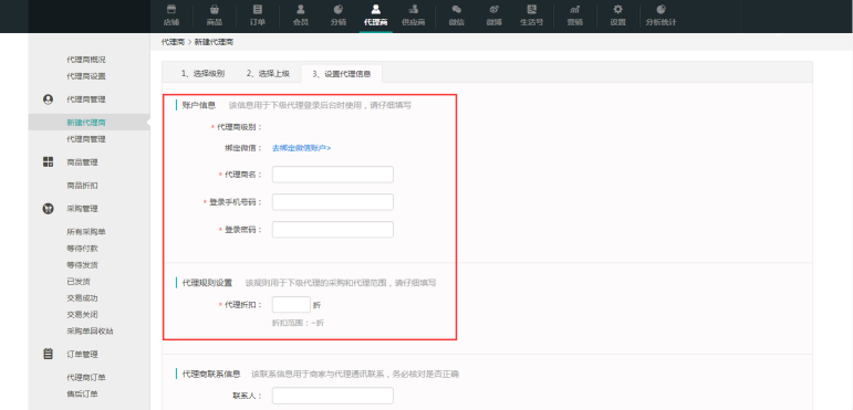 ③ 填寫代理商相關(guān)信息,名字、手機號、登錄密碼。針對于該代理商設(shè)置折扣。同時商家有需要的話,可以進一步完善代理商的個人信息,方便管理和信息查詢。