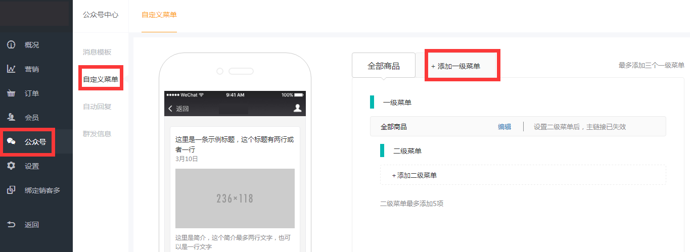 一級菜單:點(diǎn)擊編輯會彈出編輯菜單的內(nèi)容;一級菜單最多添加3個(gè)