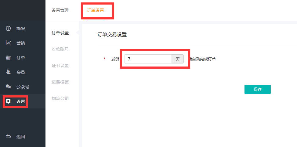 設(shè)置-訂單設(shè)置--輸入訂單發(fā)貨后自動完成訂單的天數(shù)