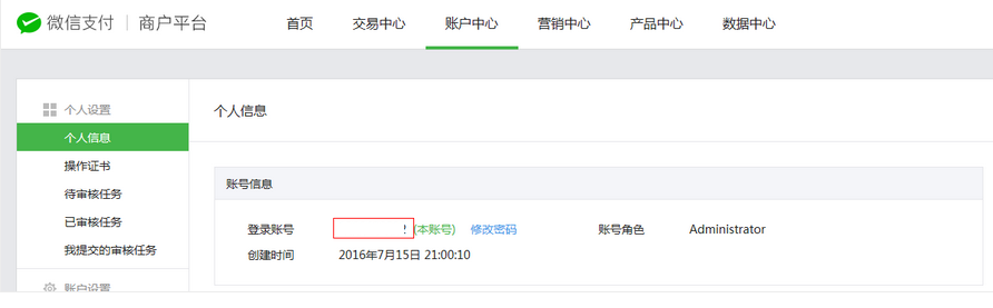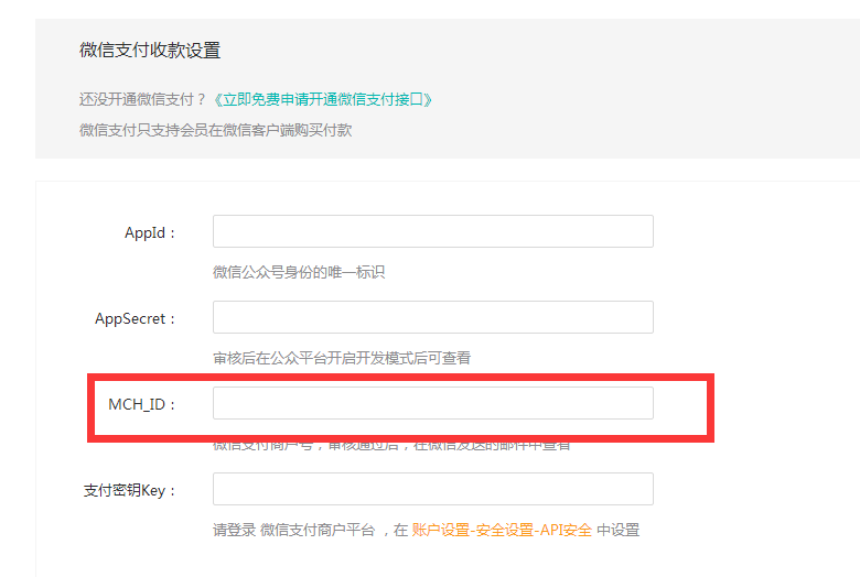 【MCH_ID】:登錄微信商戶平臺點(diǎn)擊賬戶中心-個(gè)人設(shè)置,將微信支付賬號復(fù)制到MCH_ID內(nèi)