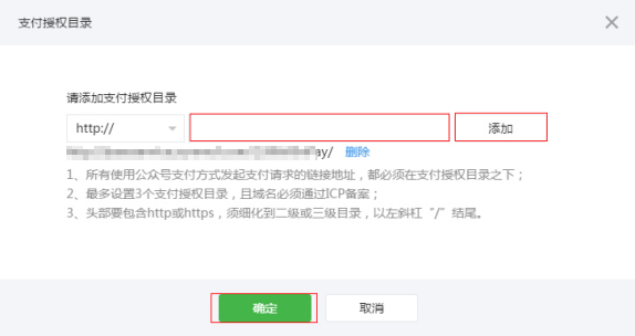 把http://member.yunmof.com/wxpay/輸入到輸入框,點(diǎn)擊添加-確定【注:此處可以添加3個(gè)鏈接】
