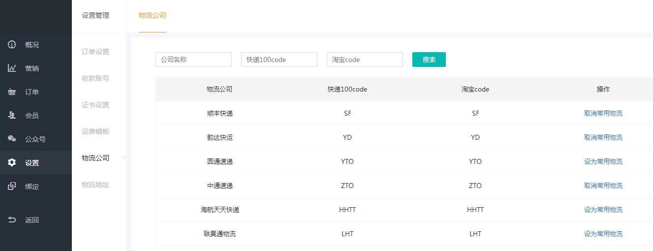 可通過公司名稱、快遞100Code、淘寶Code查詢物流公司