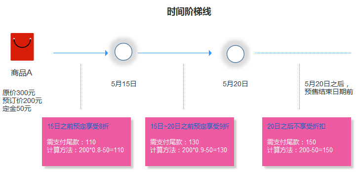 已開啟時(shí)間階梯價(jià):指在預(yù)售期間內(nèi),買家先支付一定的預(yù)定金,當(dāng)預(yù)售結(jié)束后再按 約定時(shí)間支付尾款,尾款金額根據(jù)設(shè)置的階梯時(shí)間折扣價(jià)計(jì)算,可以設(shè)置多個(gè)階梯時(shí)間,每個(gè)時(shí)間折扣不同,如下圖所示,以商品A為例;