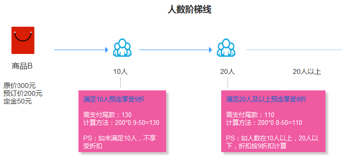 已開啟人數(shù)階梯價(jià):指在預(yù)售期間內(nèi),買家先支付一定的預(yù)定金,當(dāng)預(yù)售結(jié)束后再按約定時(shí)間支付尾款,尾款金額根據(jù)設(shè)置的階梯滿足人數(shù)折扣價(jià)計(jì)算,可以按階梯設(shè)置滿足一定人數(shù)后享受不同折扣,如下圖所示,以商品B為例;