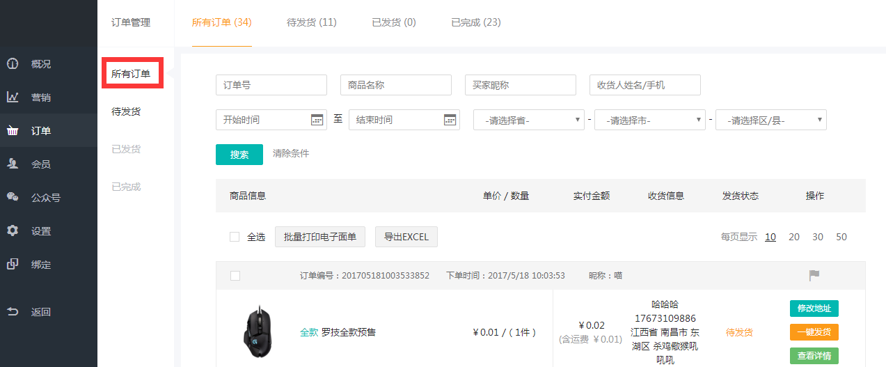 查詢:可根據(jù)訂單號、商品名稱、買家昵稱、收貨人姓名/手機(jī)、時(shí)間、地區(qū)查詢訂單;
