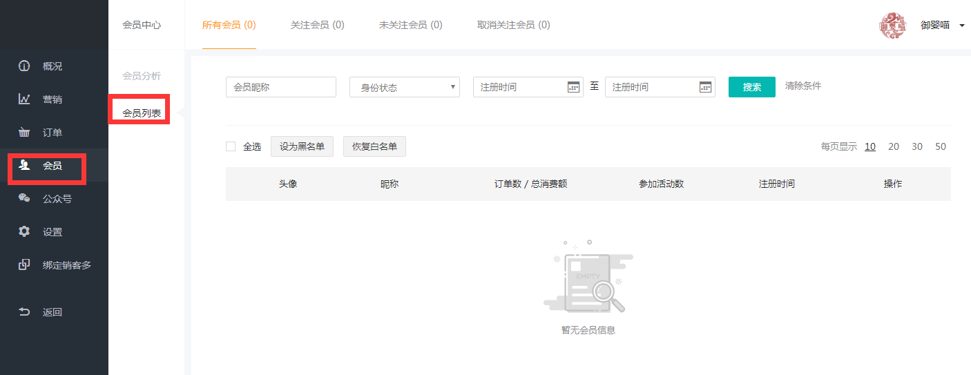 搜索:可根據(jù)會員的昵稱、身份狀態(tài)、注冊時(shí)間進(jìn)行搜索。