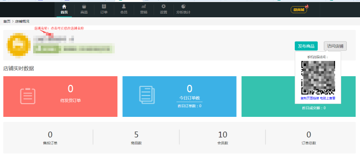 店鋪經(jīng)營(yíng)數(shù)據(jù):可以查看一周內(nèi)訂單數(shù)和新增會(huì)員數(shù)量