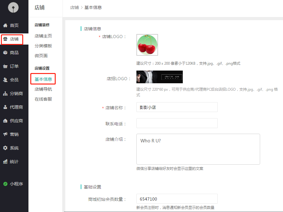 店鋪介紹:微信分享店鋪給好友時會顯示這里的文案,不會直接在前臺顯示