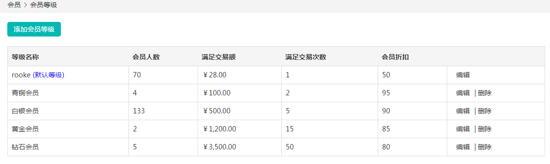 此處列出了系統(tǒng)已有的會員等級列表,以及該等級會員的信息如享受折扣;需滿足交易額等。此處支持編輯和刪除操作(注:必須要要有默認(rèn)等級,默認(rèn)等級指的是會員注冊時(shí)所在的會員等級)。