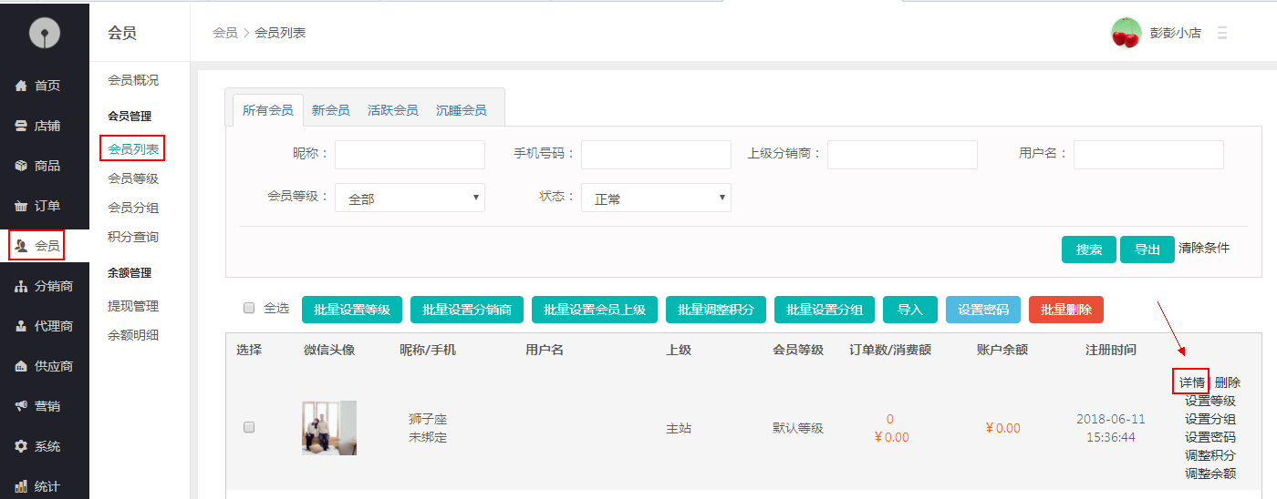 第一步,登陸逍客多系統(tǒng)后,進入“會員”模塊,點擊“詳情”,進入會員詳情頁