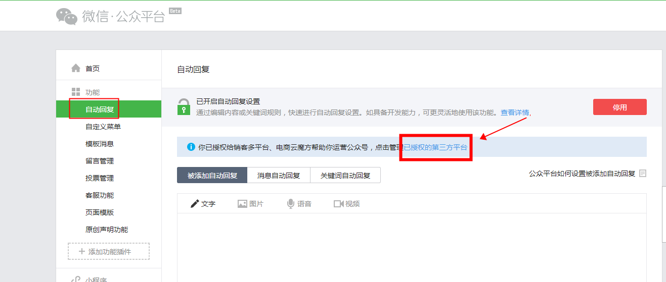 1、登錄微信公眾后臺--》》點擊自動回復(fù)---》》點擊已授權(quán)的第三方平臺