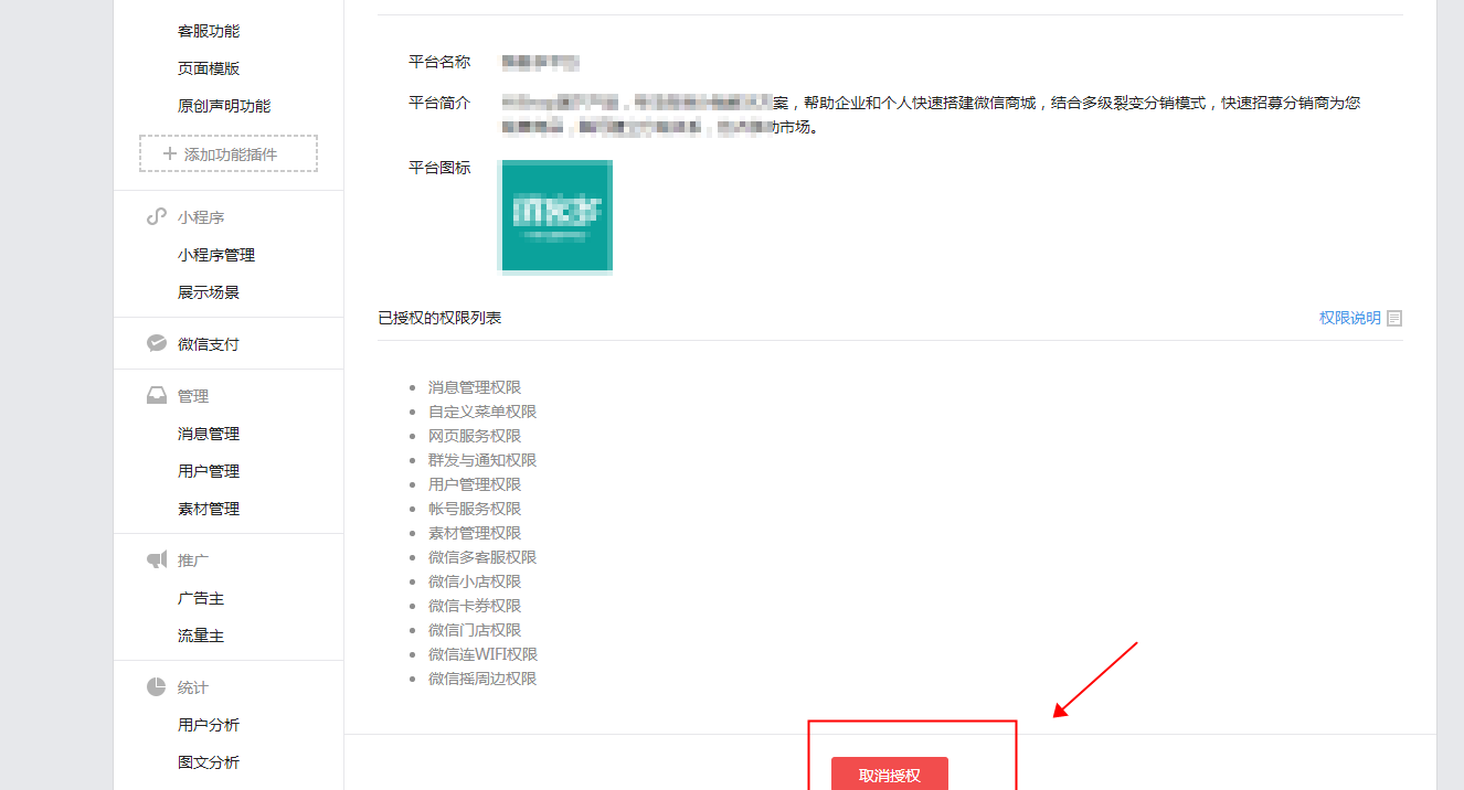 注:將微信公眾號與安菲云解綁后,安菲云商城就是一個全新的商城,重新綁定新的微信公眾號所有信息不會同步,請謹慎取消綁定。