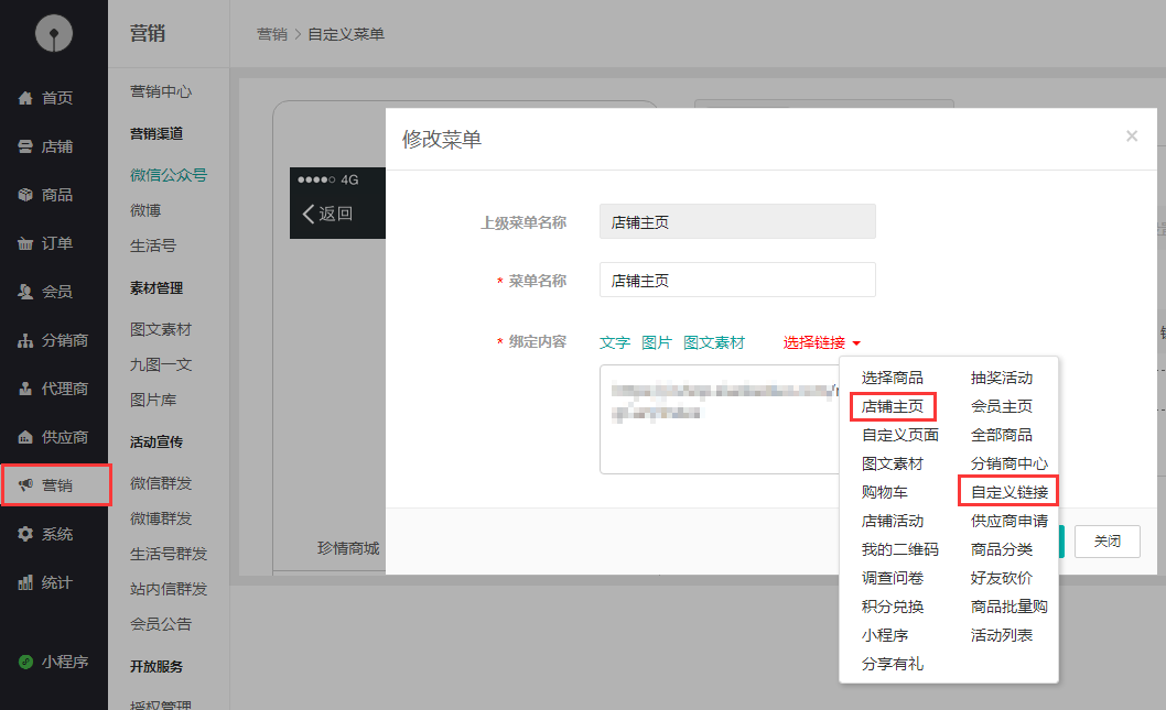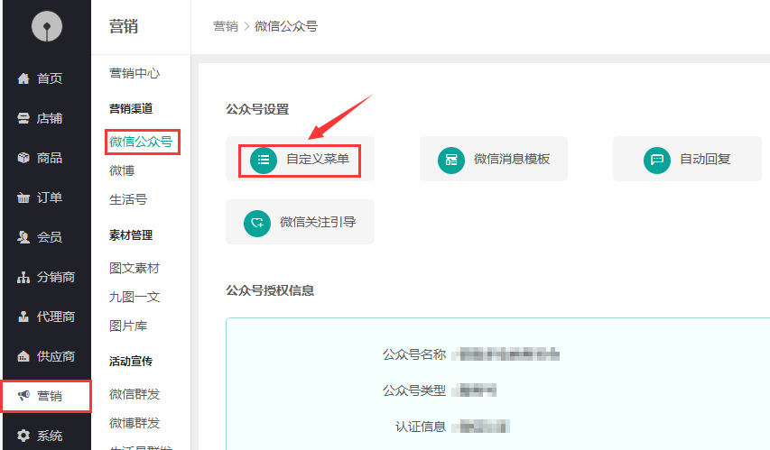 1、在微信--營(yíng)銷(xiāo)--微信公眾號(hào)自定義菜單中添加