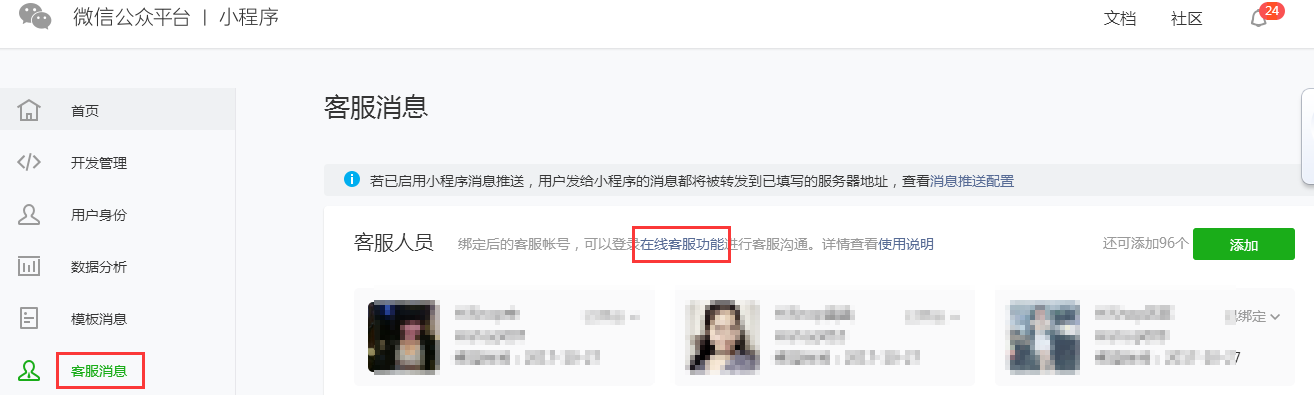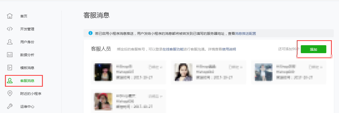 登陸微信小程序后臺(https://mp.weixin.qq.com/)--客服消息--客服人員--添加,目前小程序支持綁定不多于100個客服人員