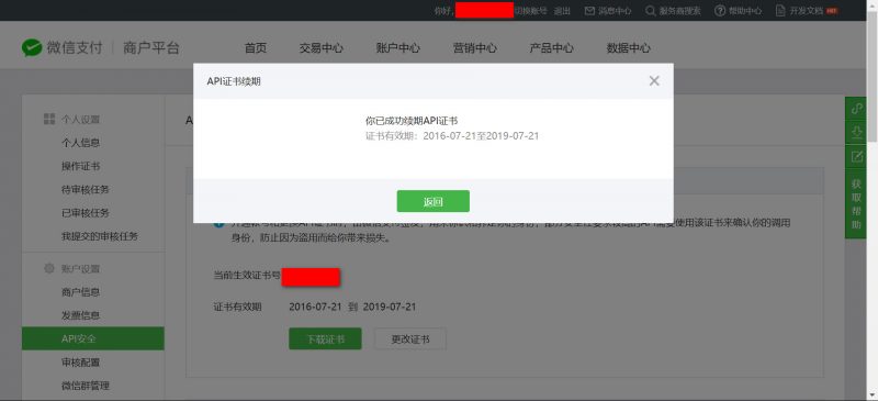 3) 微信api證書續(xù)期成功可以看到在證書有效期那里,有效期已經(jīng)延長一年,之后再點擊返回即可。
