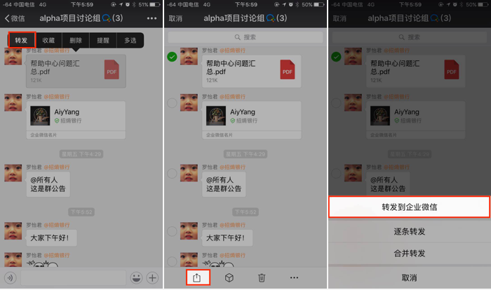 1.微信會話消息長按多選可轉(zhuǎn)發(fā)會話內(nèi)容到企業(yè)微信,在微信側(cè),是可以實現(xiàn)此功能的。針對文本、圖片等消息,長按選擇【多選】,再點擊左下角轉(zhuǎn)發(fā)按鈕,選中【轉(zhuǎn)發(fā)到企業(yè)微信】即可;