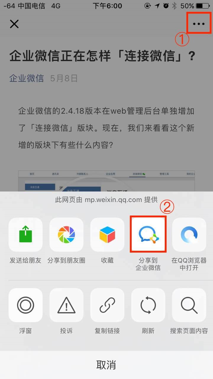 2.公眾號文章可分享至企業(yè)微信,針對公眾號文章,點擊右上角的功能鍵,選擇分享至企業(yè)微信。