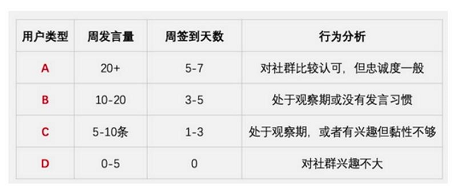 2、建立用戶的評價機制,也是對用戶按照每周發(fā)言的量、簽到的天數進行劃分,分析他們的行為,再根據行為給出方案