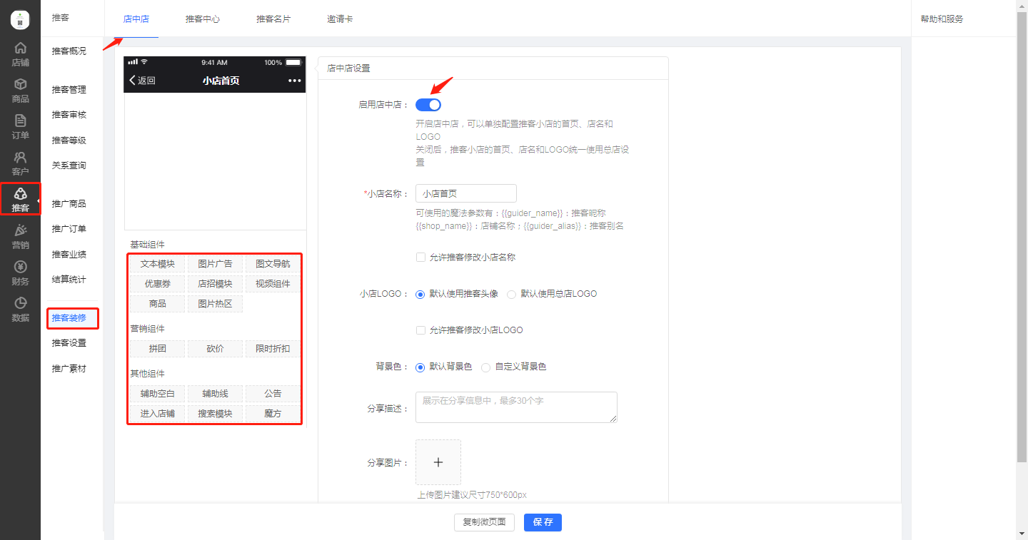 打開后臺推客模快,點(diǎn)擊推客裝修,啟用店中店,與店鋪首頁裝修一樣,利用組件來設(shè)置想要的效果即可