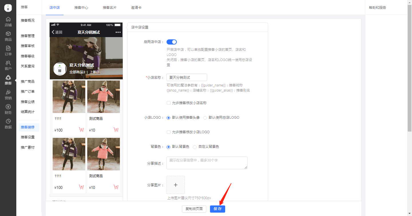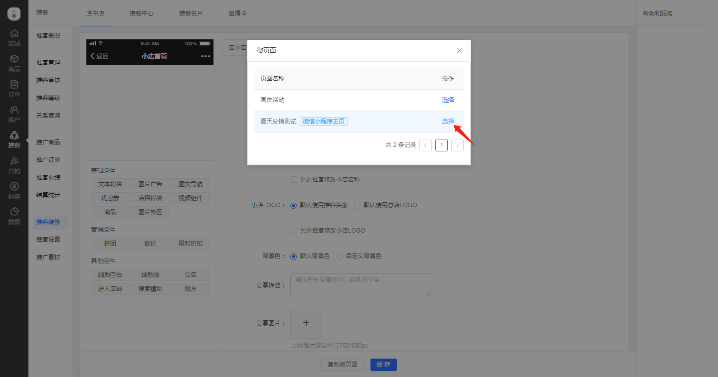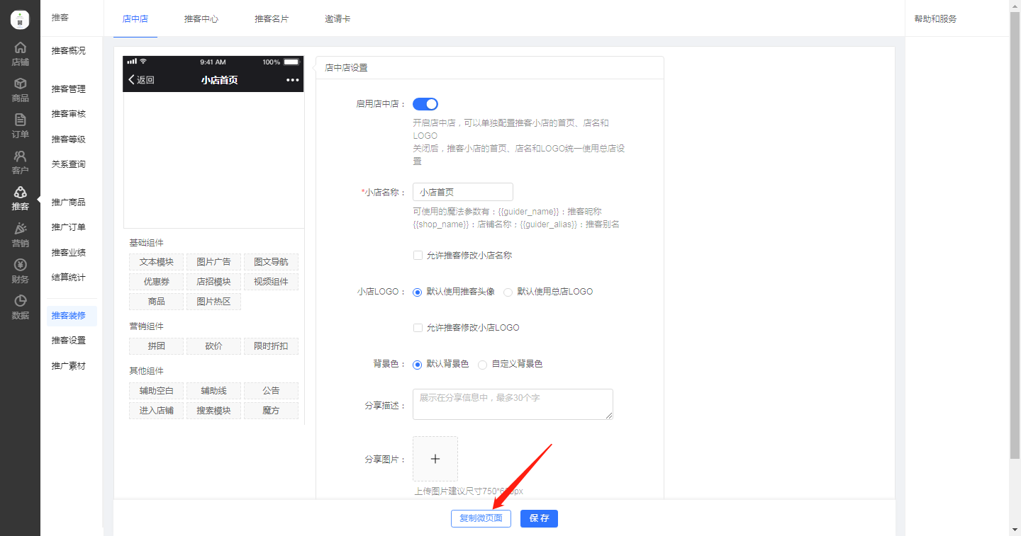 打開后臺推客??欤c(diǎn)擊推客裝修,啟用店中店,復(fù)制微頁面,選擇頁面,然后保存即可