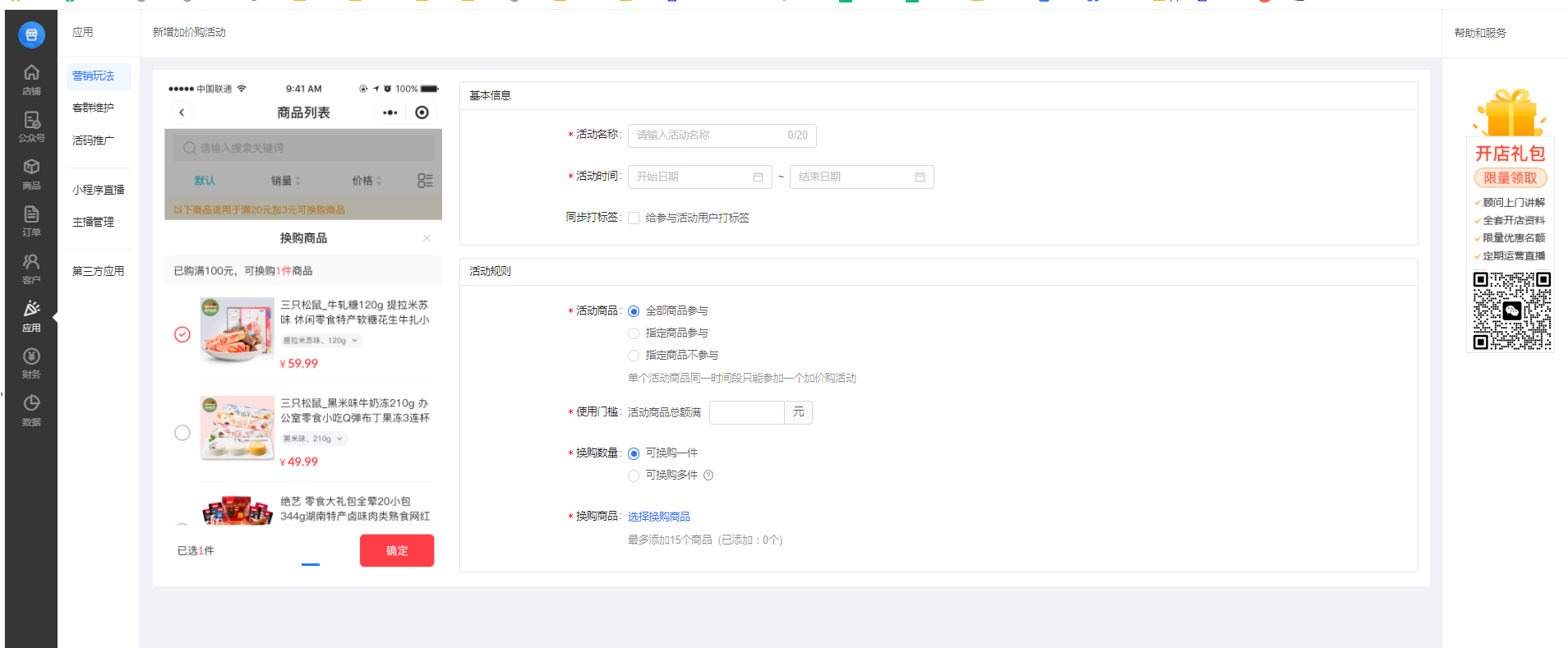 登錄https://account.jszxcn.com/管理后臺,打開應(yīng)用--營銷玩法--加價購--新建加價購,設(shè)置好活動信息