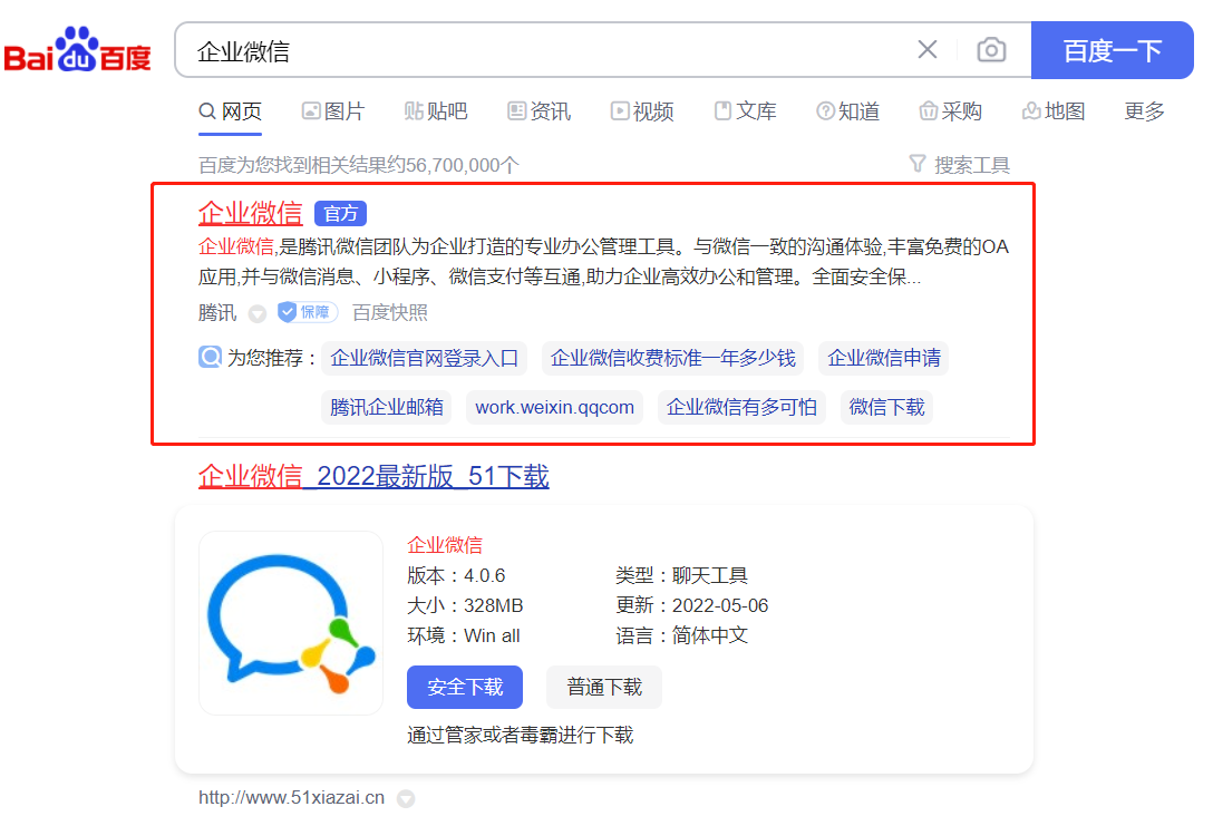 在百度瀏覽器中,搜索企業(yè)微信并點擊進入,或者打開https://work.weixin.qq.com/鏈接直接進入注冊。