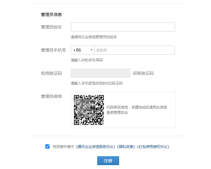 入管理員姓名、手機號,并用微信掃碼綁定賬號,綁定成功后,勾選企業(yè)微信服務(wù)協(xié)助,提交注冊