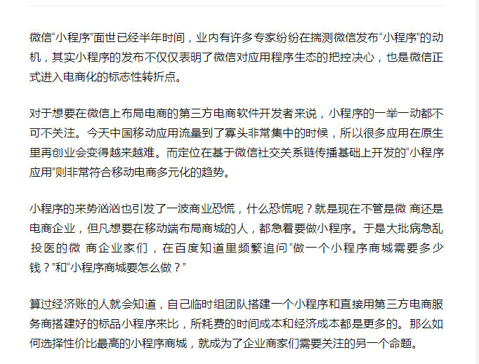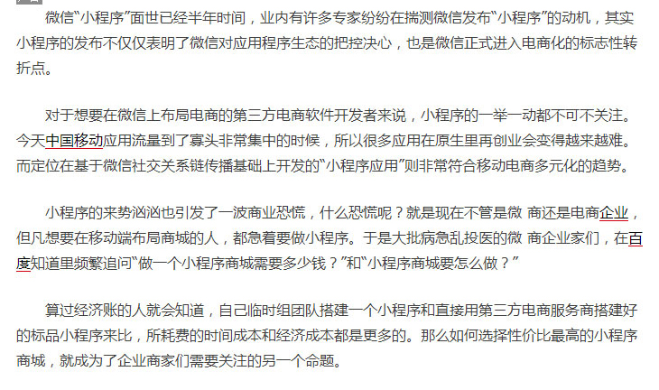 小程序的來勢洶洶也引發(fā)了一波商業(yè)恐慌,什么恐慌呢?就是現(xiàn)在不管是微商還是電商企業(yè),但凡想要在移動端布局商城的人,都急著要做小程序。于是大批病急亂投醫(yī)的微商企業(yè)家們,在百度知道里頻繁追問“做一個小程序商城需要多少錢?”和“小程序商城要怎么做?”