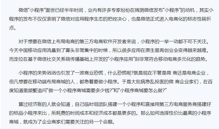對于想要在微信上布局電商的第三方電商軟件開發(fā)者來說,小程序的一舉一動都不可不關(guān)注。今天中國移動應(yīng)用流量到了寡頭非常集中的時候,所以很多應(yīng)用在原生里再創(chuàng)業(yè)會變得越來越難。而定位在基于微信社交關(guān)系鏈傳播基礎(chǔ)上開發(fā)的“小程序應(yīng)用”則非常符合移動電商多元化的趨勢。