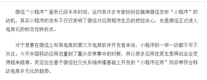 微信“小程序”面世已經(jīng)半年時間,業(yè)內(nèi)有許多專家紛紛在揣測微信發(fā)布“小程序”的動機,其實小程序的發(fā)布不僅僅表明了微信對應(yīng)用程序生態(tài)的把控決心,也是微信正式進入電商化的標(biāo)志性轉(zhuǎn)折點。