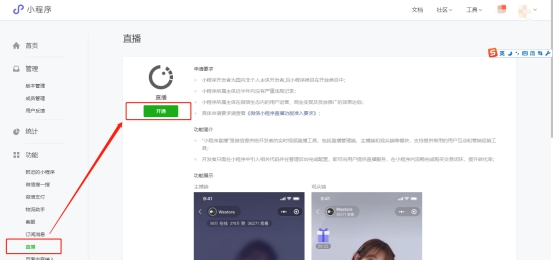 登錄微信小程序后臺https://mp.weixin.qq.com,左側(cè)菜單--直播--開通直播,直播開通滿足微信相關(guān)類目要求、運營要求。