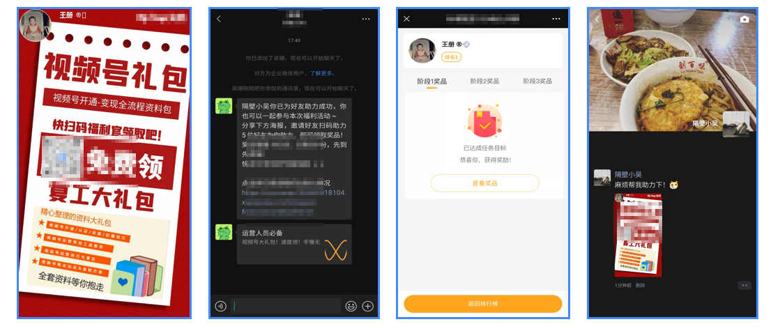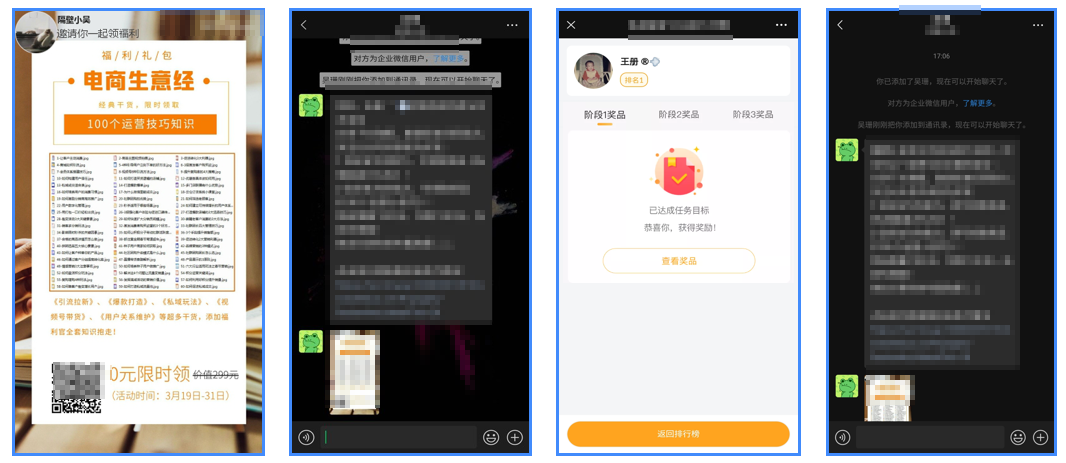 1分享任務(wù)活動海報,用戶看到活動海報 →2用戶掃碼添加企微好友,收到活動規(guī)則海報→3用戶分享活動海報,完成任務(wù)即可領(lǐng)取獎品→4 分享海報給好友,助力成功收到提醒